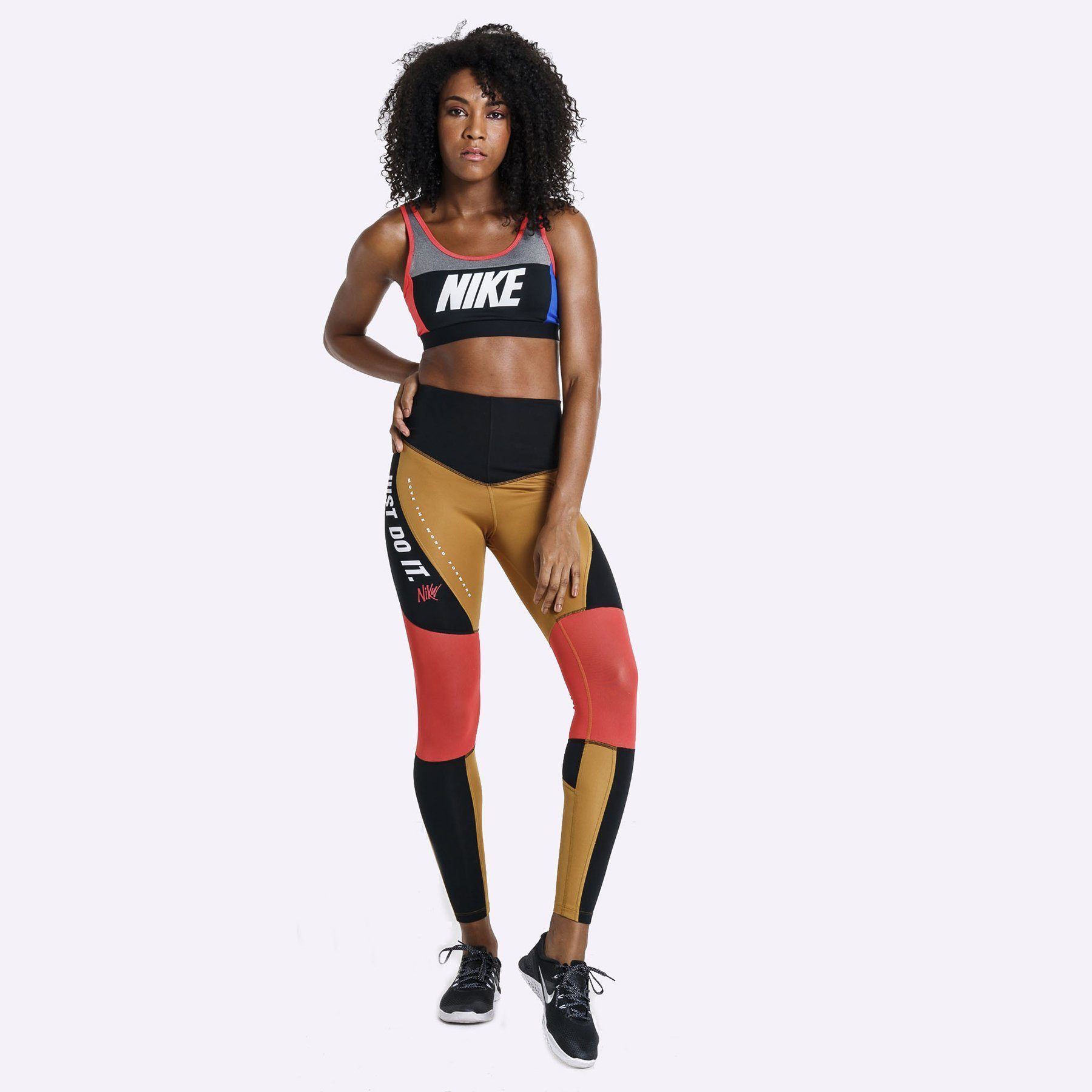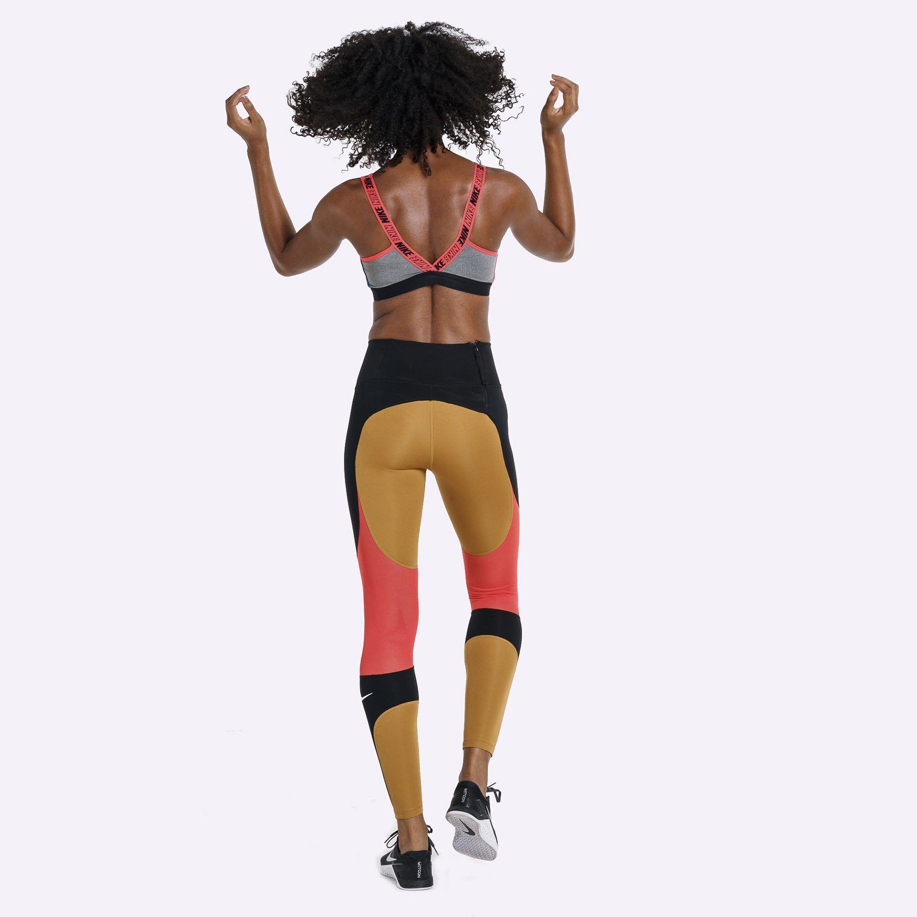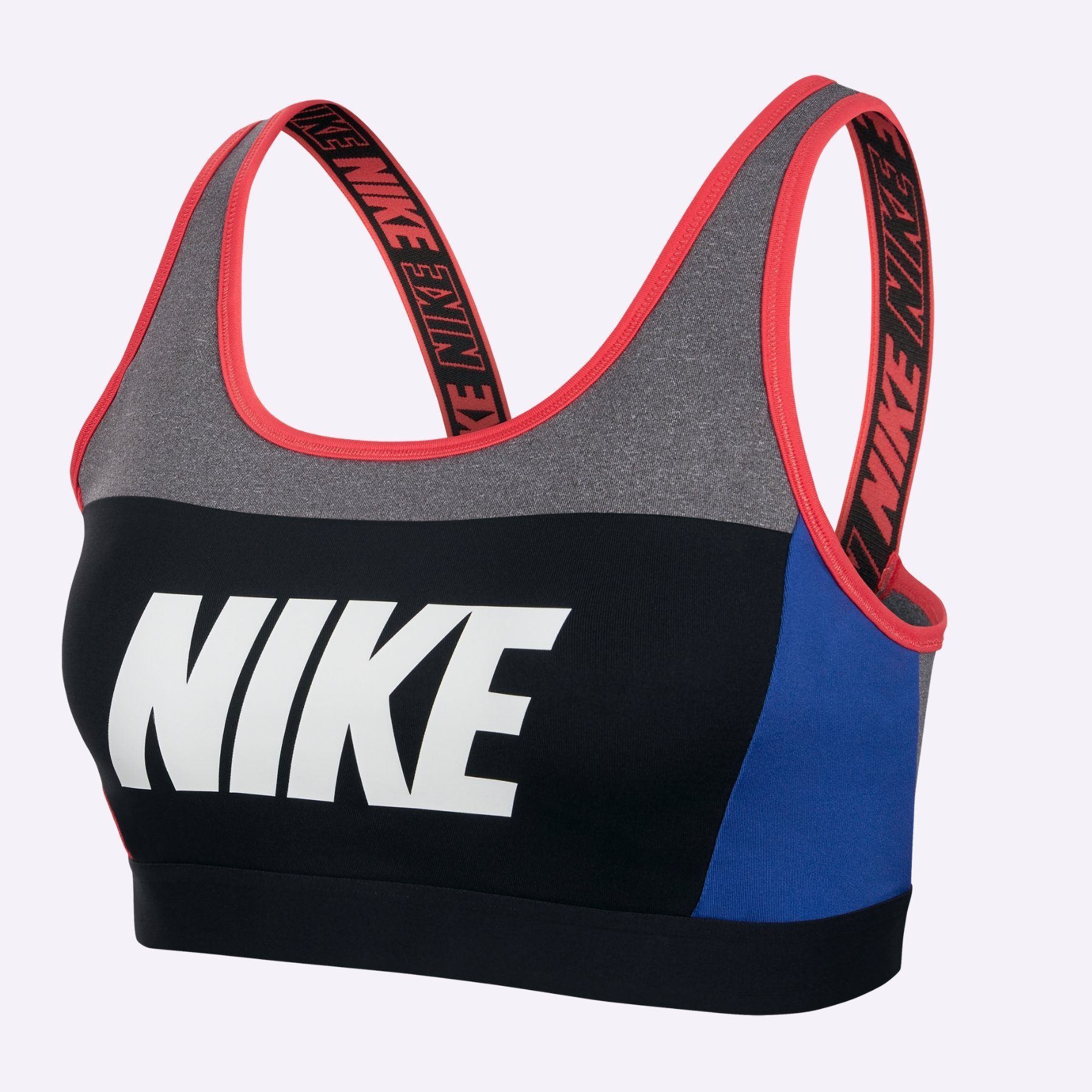 A breathable V-back strap design lets you move freely during high intensity workouts such as spin and running, while "NIKE" graphics on the straps and chest make a bold statement.